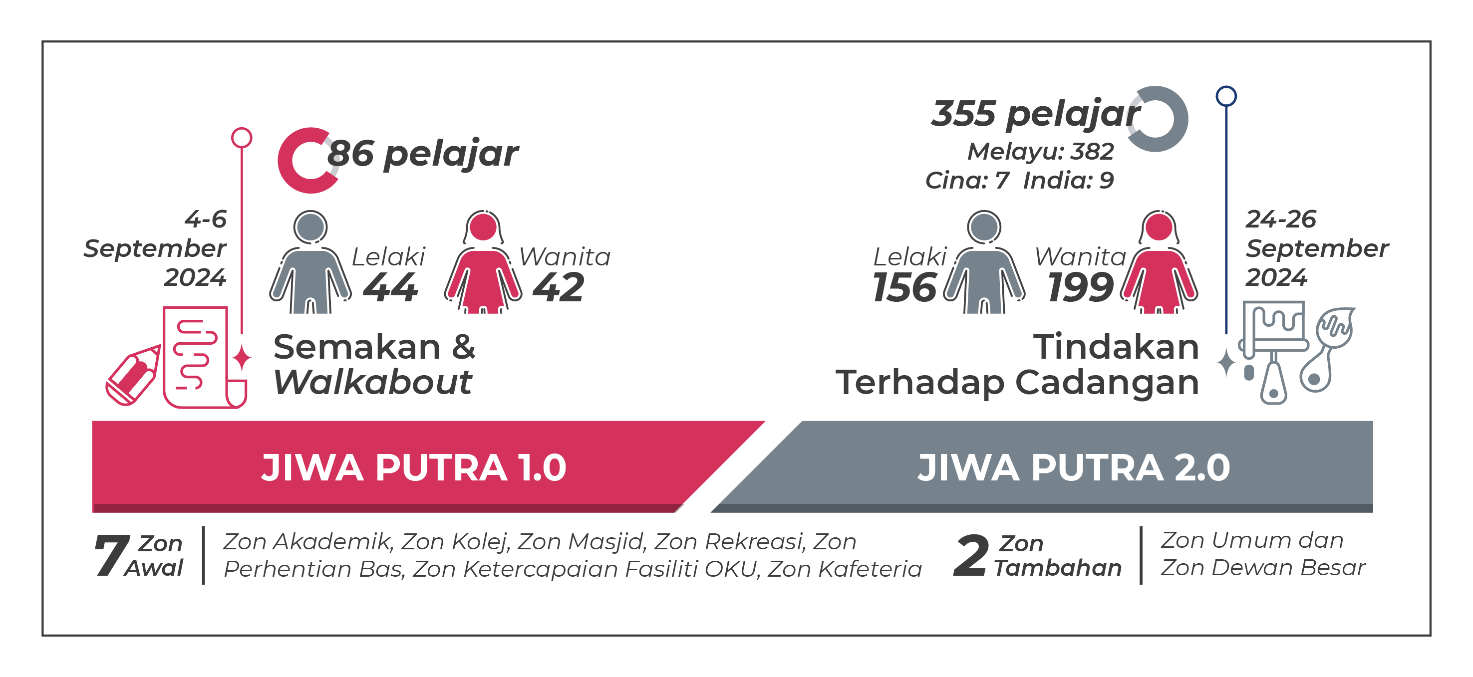 On September 4-5, 2024, a walkabout session was carried out. A walkabout is a journey or survey to identify areas in need of attention by the university or the Jiwa Putra team. A group of 86 students was divided into zones to carry out the survey for further action.