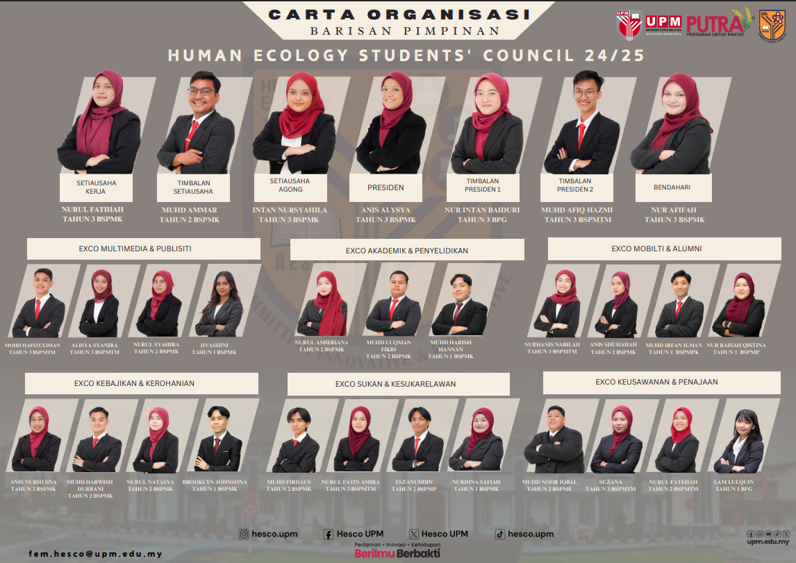 The name of the organization for this association is the Human Ecology Student's Association, abbreviated as HESA. The Student Association of the Faculty of Human Ecology was established in 2007.