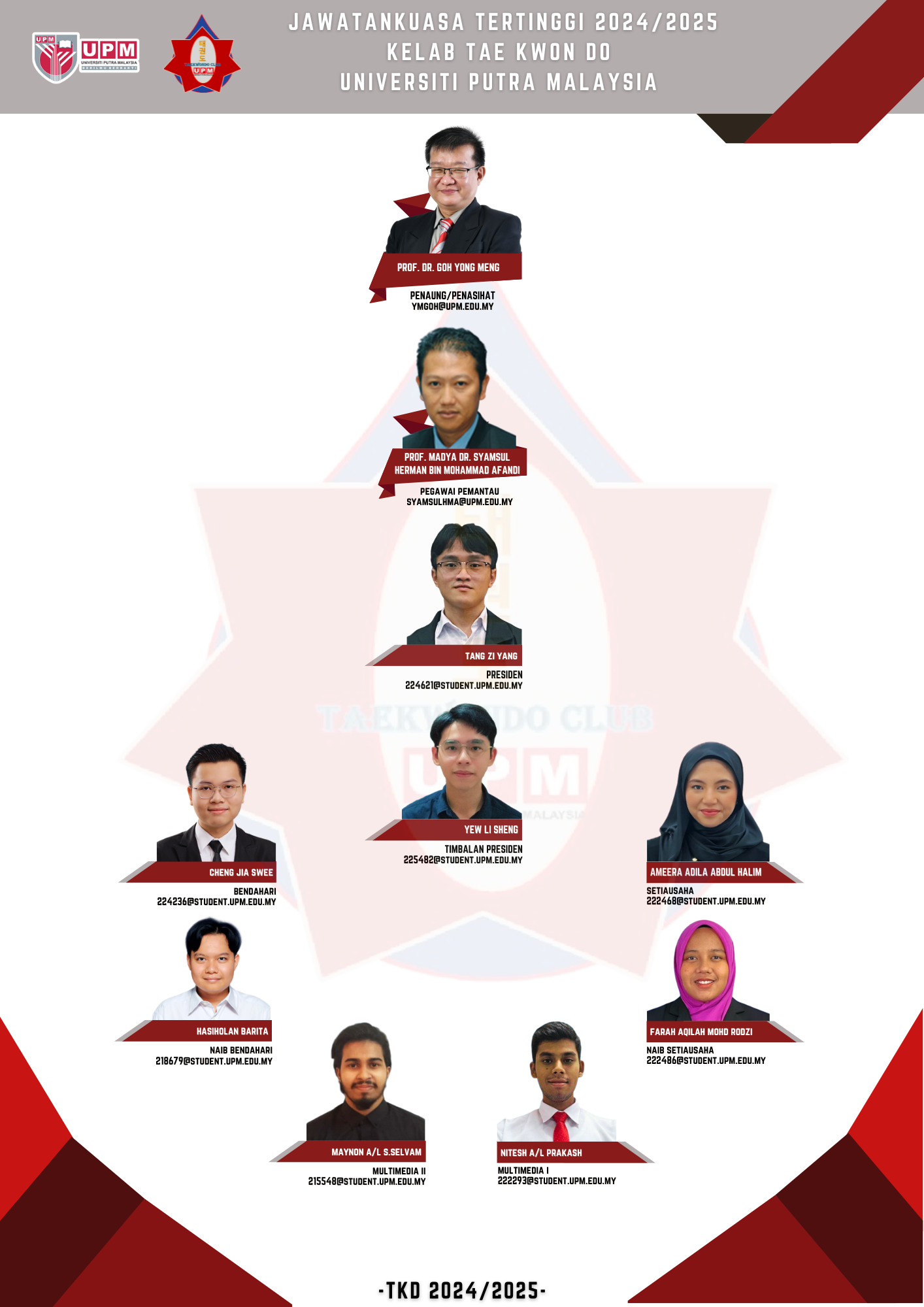 The Taekwondo Club UPM is an association that focuses on training students in the martial art of Taekwondo, under the authority of Kukkiwon, the official headquarters of Taekwondo founded in South Korea. The activities run by this association include Taekwondo training sessions every Monday and Wednesday from 8:30 PM to 10:00 PM at the Academic Complex A (KAA) UPM. Additionally, Taekwondo qualification tests for belt promotions are held twice every semester. In the second semester, the annual Intercollege Championship is organized, involving matches between UPM residential colleges.